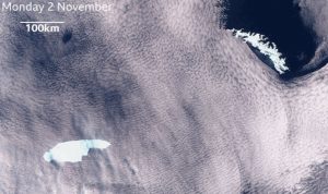 Las imágenes muestran que el iceberg se ha reducido a la mitad desde un área inicial de 5.664 kilómetros cuadrados hasta su extensión actual de solo 2606 kilómetros cuadrados. Una gran parte de esta pérdida se debe a la creación de icebergs más pequeños, algunos de los cuales aún están a flote.