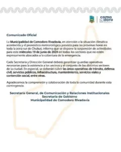 Por el pronóstico meteorológico previsto para las próximas horas, el Municipio informa que se dispone la suspensión de actividades para este miércoles 19 de junio en todos los sectores que no estén expresamente abocados a la cobertura de la emergencia. Comodoro 24