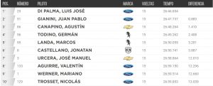 Con el piloto del Maquin Parts Racing afirmado en la punta, la atención de la carrera se concentró en la pelea por el segundo puesto entre el Ford de Juan Pablo Gianini y el Chevrolet de Agustín Canapino. En esa disputa prevaleció el saltense, quien se subió así al segundo escalón del podio. Canapino, líder del campeonato, tuvo que conformarse con la tercera posición.