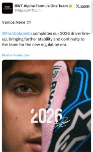 No solo eso. El equipo hizo el anuncio oficial a las 10.43, por los números de Pierre Gasly y Colapinto. Todo después del encuentro pactado con el equipo Alpine para la prensa de habla hispana. Todo un detalle.