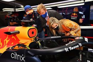 Un Verstappen hiper feliz tomó una bandera de los Países Bajos y la alzó apuntando a sus hinchas en medio de la celebración.