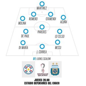 • Argentina: Emiliano Martínez; Nahuel Molina, Cristian Romero, Nicolás Otamendi y Marcos Acuña; Rodrigo De Paul, Leandro Paredes y Giovani Lo Celso; Ángel Di María, Joaquín Correa y Lionel Messi. DT: Lionel Scaloni.