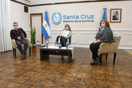 Desde Salón Gregores de Casa de Gobierno, la primera mandataria santacruceña acompañada del jefe de Gabinete de Ministros, Leonardo Álvarez; y la ministra Secretaria General de la Gobernación, Claudia Martínez.
