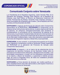 En el comunicado; Argentina, Paraguay, Panamá, Ecuador, Bolivia y Perú; reiteraron su «compromiso con la defensa de las instituciones democráticas, la plena vigencia del Estado de Derecho, los esfuerzos intergubernamentales para fortalecer el multilateralismo, la articulación de los mecanismos de defensa de la democracia, los principios fundamentales del derecho internacional, así como la protección y promoción irrestrictas de los derechos humanos y de las libertades fundamentales, todos ellos elementos esenciales para el proceso de integración regional, el desarrollo y la prosperidad».