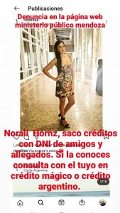 “No me gusta tener que hacer esto, pero no se puede tapar más y nos ha afectado a muchas personas! Norali Hornz, de San Martin, una compañera nuestra de trabajo pedía una copia del DNI, para una encuesta de la facultad y sacó préstamos a nuestros nombres, por montos exorbitantes”, cuenta Silvina López en su cuenta de Facebook