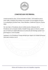En otro apartado, la Oficina del Presidente Javier Milei confirmó que Donal Trump vendrá a Buenos Aires a reunirse con el economista libertario. «Asimismo, el ex Presidente Trump anticipó que viajará a la Ciudad de Buenos Aires para reunirse con él (Javier Milei)», dice el comunicado.