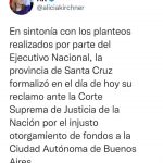 La gobernadora santacruceña Alicia Kirchner anunció a través de las redes oficiales qué acciones determinó en función al accionar de la Justicia con el otorgamiento final de los fondos a la ciudad autónoma de Buenos Aires. El gobierno de Santa Cruz reclamó a la Corte Suprema de Justicia por tal efecto.