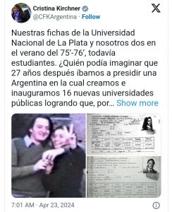 En un posteo en la red social X, la exvice publicó las fichas de la Universidad Nacional de La Plata de ella y del expresidente Néstor Kirchner: «¿Quién podía imaginar que 27 años después íbamos a presidir una Argentina en la cual creamos e inauguramos 16 nuevas universidades públicas logrando que, por primera vez, todas las provincias tengan una universidad pública?», se preguntó.