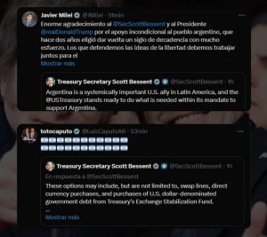 En tanto, Javier Milei respondió: «Enorme agradecimiento al secretario Scott Bessent y al presidente Donald Trump por el apoyo incondicional al pueblo argentino, que hace dos años eligió dar vuelta un siglo de decadencia con mucho esfuerzo. Los que defendemos las ideas de la libertad debemos trabajar juntos para el bienestar de nuestros pueblos. Nos vemos el martes en Nueva York».
