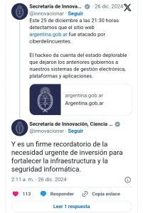 El periodista Julio Ernesto López (@julitolopez) también se refirió al tema a través de sus redes sociales, señalando: “Mientras parte de Argentina.gob.ar está caída por el hackeo, otra parte todavía online deja rastros de lo que pasó.””Masivo deface en Argentina.gob.ar. En definitiva, se metieron el ciberpatrullaje y la flamante unidad de ciberdefensa en el culo.”
