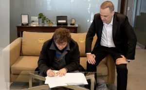 Milei y el Jefe de Gabinete Adorni, rubricando el Decreto sobre la creación del ente anti fake