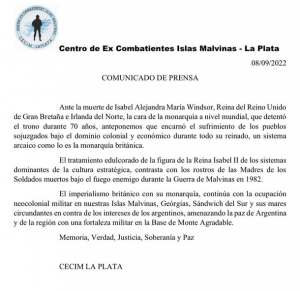 El Centro de Ex Combatientes Islas Malvinas de La Plata sentenció que la monarquía británica «encarnó el sufrimiento de los pueblos sojuzgados bajo el dominio colonial y económico durante todo» el reinado de Isabel.