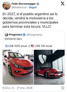 “En 2027, si el pueblo argentino así lo decide, vendrá la motosierra a los gobiernos provinciales y municipales para terminar esta locura. VLLC!”, escribió el mandatario.