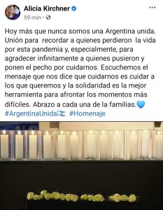 Hoy más que nunca somos una Argentina unida. Unión para recordar a quienes perdieron la vida por esta pandemia y, especialmente, para agradecer infinitamente a quienes pusieron y ponen el pecho por cuidarnos. Escuchemos el mensaje que nos dice que cuidarnos es cuidar a los que queremos y la solidaridad es la mejor herramienta para afrontar los momentos más difíciles. Abrazo a cada una de la familias.💙