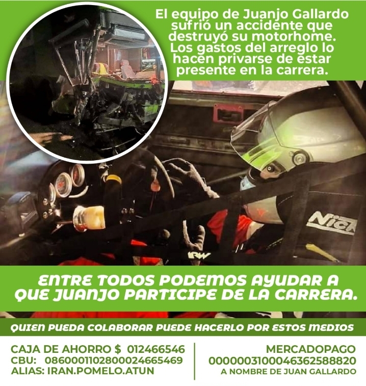 Mientras en su el equipo tratan de reparar el motorhome en Pilar y el piloto permanece en Buenos Aires, en Río Gallegos su entorno más cercano impulsó una campaña solidaria para recaudar fondos «para que Juanjo pueda correr el fin de semana» poniendo a disposición un número de cuenta bancaria a nombre de Juan Gallardo.