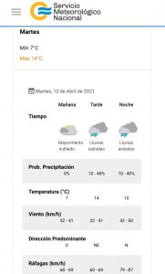 Para este martes en la capital santacruceña habrá una temperatura máxima de 14 grados, con probabilidad de lluvias aisladas por la tarde y noche. Y por si esto fuese poco, con vientos que alcanzarán los 50 km/h con ráfagas que irán intensificándose hacia la noche rozando casi los 90 km/h.