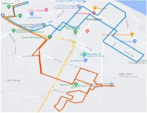VUELTA: B. Puerto Argentino- José Ingeniero – Santiago del Estero –Mascarello-A. Gral. Ángel Sureda- Orkeke- Av. José de San Martin-Av. Néstor Kirchner-Entre Ríos-Santa Fe – Eva Peron – A. Banciella – Lisandro De la Torre – JoseMarty – San J. Obrero – Pje. Abalos – Parque Industrial-Empresa Citybus.