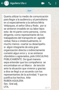«Quería utilizar tu medio de comunicación para llegar a la audiencia y al periodismo en sí especialmente a la señora Mirta Velázquez, el señor Silva y Rodo. por si se sintieron invadido en su labor lejos esta de mi parte como persona, como dirigente, como representante de los trabajadores del transporte en agredir verbal, física o intelectualmente, ni mucho menos coartar su desempeño. si algún integrante de esta gran organización directa o indirectamente cometió algun error y si se sintieron ofendidos o agraviados, pido DISCULPAS PÚBLICAMENTE. De igual manera sepa entender que los compañeros se encontraban en un Marco de tención ante la situación que vivieron y gracias a dios se llegó a un acuerdo con los representantes de la actividad. Y que no justifica los hechos. Atte