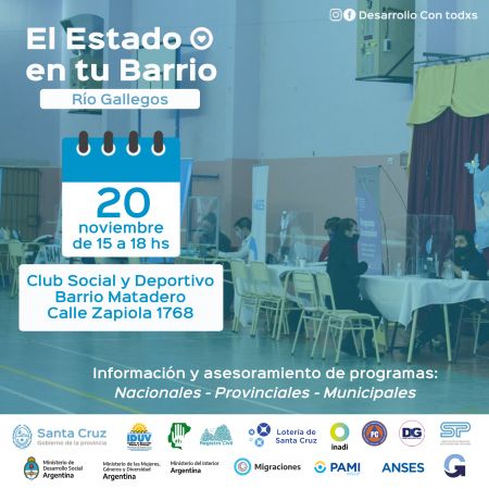 En esta oportunidad, el dispositivo se llevará a cabo en instalaciones del Club Matadero; sito en Zapiola 1768, de la ciudad de Río Gallegos. Es importante recordarle a vecinas y vecinos que durante la jornada podrán asesorarse e inscribirse en los distintos programas que lleva adelante la Cartera Social Provincial, como Ser.Sol y Tarjeta Social; así como también de los entes gubernamentales participantes.