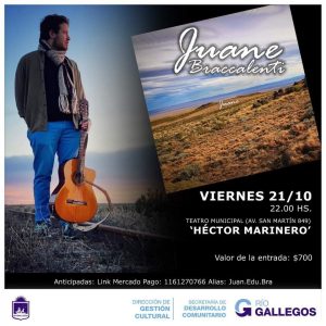 El próximo viernes, 21 de octubre, el reconocido autor y músico riogalleguense Juane Braccalenti brindará un show en el Teatro Municipal Héctor Marinero.