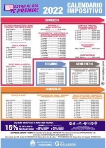 Para quienes estén al día al 19 de febrero con el impuesto Patente Automotor, se realizará el sorteo de 10 viajes: cinco a Puerto Madryn y otros cinco a Puerto Iguazú. En tanto, todo aquel vecino que esté al día al 12 de marzo de 2022 con los impuestos baldío, inmobiliario urbano, suburbano y arrendamiento de tierra fiscal, tasa por recolección y tratamiento de residuos sólidos domiciliarios, barrido, limpieza y conservación de la vía pública, participará por el sorteo de 10 órdenes de compra de 50.000 pesos en materiales de construcción y 10 televisores Smart TV.