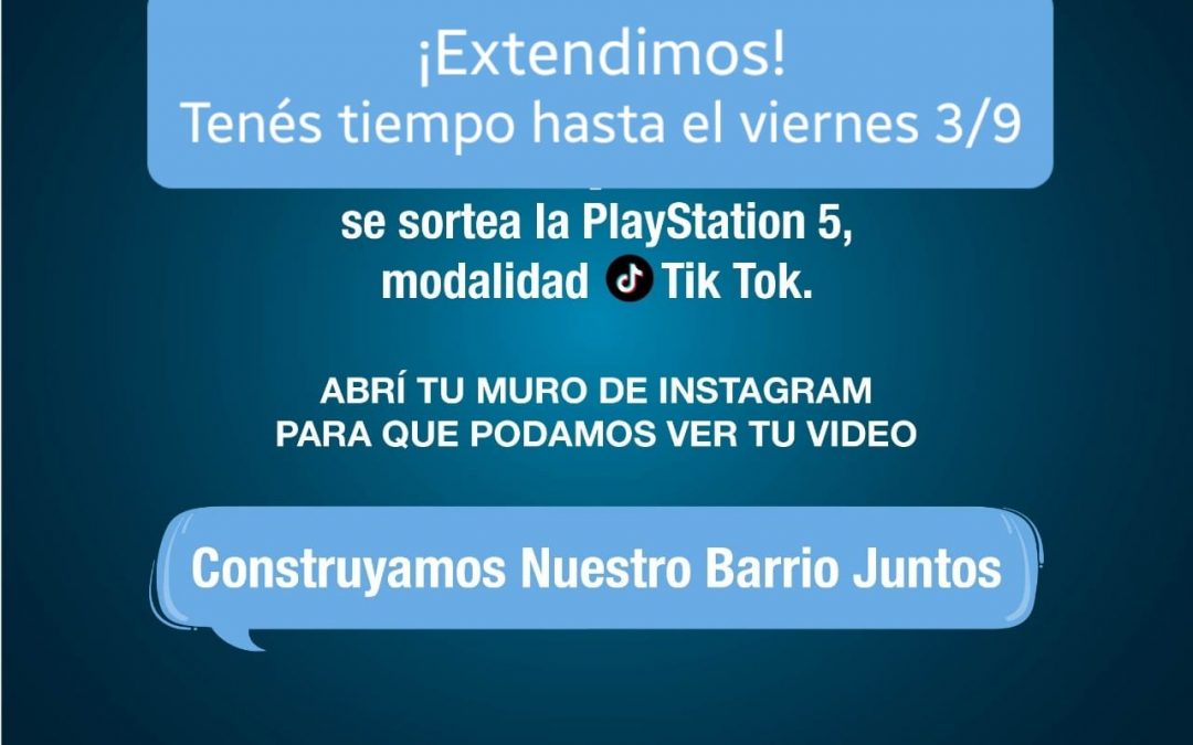 Río Gallegos, 2 de Septiembre de 2021-(MRG)- Este viernes se realizará el sorteo de una de las Play Station 5 para quienes hayan participado en la modalidad de Tik Tok por redes sociales en la iniciativa “Construyamos Nuestro Barrio Juntos”, propuesta que organizan en forma conjunta la Secretaria de Niñez, Adolescencia y Familia y la Secretaria de Obras Públicas con el fin de promover la participación de niños, niñas y adolescentes que pueden elegir qué tipo de playón deportivo quieren tener en su barrio.