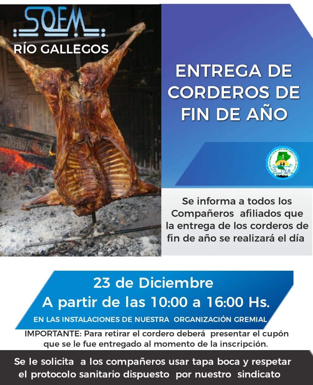 “Mañana miércoles (por hoy) comenzaremos la parte logística desde horas tempranas con los integrantes de la Comisión Directiva y colaboradores” “A partir de las 10:00 horas estará llegando el camión para comenzar con la entrega correspondiente del tradicional cordero de fin de año” “Agradecemos la paciencia de cada compañero y compañera y pedimos que mañana nos cuidemos entre todos, respetando la distancia social y, el uso de barbijo es obligatorio”.
