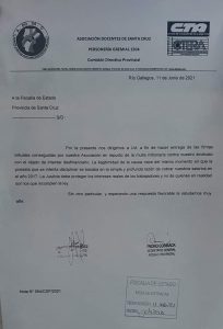 En la jornada, los dirigentes encabezados por su secretario general Pedro Cormack y el movimiento docente reunieron firmas en la capital para luego ser presentadas en nota a la Fiscalía de Estado de Santa Cruz expresando el rechazo enérgico a la multa millonaria » que se pretende imponer a la ADOSAC por la lucha llevada a cabo en 2017 contra el retraso en el pago de haberes», tal se indicó desde el gremio hace instantes.