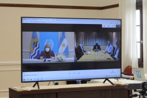 La primera mandataria fue acompañada por jefe de Gabinete, Leonardo Álvarez en Casa de Gobierno. En tanto el ministro de Economía, Finanzas e Infraestructura, Ignacio Perincioli estuvo presente en la sede de la cartera nacional y participó del encuentro de manera virtual.