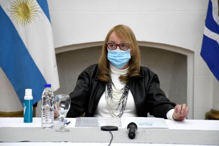 Desde Salón Blanco de Casa de Gobierno, la primera mandataria santacruceña estuvo acompañada del jefe de Gabinete, Leonardo Álvarez; y los ministros de Gobierno, Leandro Zuliani; y de Economía, Finanzas e Infraestructura, Ignacio Perincioli.