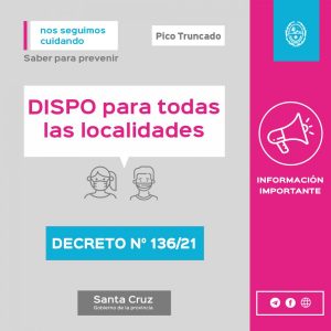 Mediante Decreto Provincial N°136/21, el Gobierno Provincial adhirió hasta el 28 de febrero a los términos del Decreto Nacional Nº 67/2021, quedando alcanzadas todas las localidades que integran el territorio provincial por las normas que componen el “Distanciamiento Social, Preventivo y Obligatorio”.