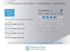 El gobierno informa que los haberes de octubre estarán acreditados mañana sábado 31 para todos los jubilados y las jubiladas. Respecto del cobro presencial en el Banco Santa Cruz, se dividirá en cuatro días para reducir la aglomeración de personas en espacios cerrados atendiendo a la situación epidemiológica vigente y para resguardar a los adultos mayores.