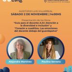 14:00 Alejandra Martínez y Paulina Serrano, docentes de Caleta Olivia, presentarán los libros «Guía para el docente A.D.I Atención a la diversidad e Inclusión» y «Corazón a cuadritos. Las emociones del docente debajo del guardapolvo», publicaciones que brindan herramientas para el abordaje interdisciplinario de la diversidad.