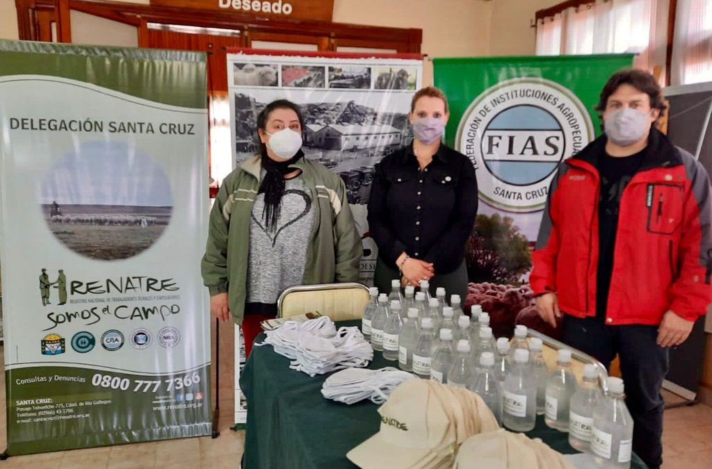 El Registro Nacional de Trabajadores y Empleadores Rurales, Delegación Santa Cruz, avanza con la distribución de Kits Preventivos del COVID-19, conformados por alcohol en gel, barbijos y guantes. En esta oportunidad el equipo de la entidad, encabezado por la delegada subrogante Johana Guillermé, visitó la localidad de Puerto Deseado y fue acompañado en la entrega de los elementos por el vicepresidente de la Sociedad Rural de dicha ciudad, Sebastián Apesteguia.