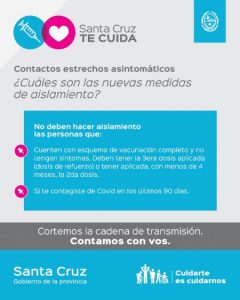 En el marco de la decisión adoptada ayer por el Consejo Federal de Salud, en Santa Cruz se adoptaron nuevas medidas como hisopar únicamente a personas sintomáticas en tres supuestos: que no hayan tenido un contacto estrecho con caso confirmado, mayores de 60 años, y personas con factores de riesgo. Además se exime del aislamiento a personas asintomáticas con un mínimo de dos dosis del esquema de vacunación, con la última dosis recibida hace menos de 3 meses.