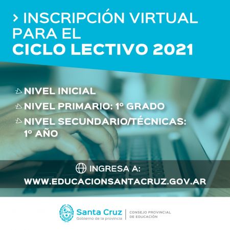 El Consejo Provincial de Educación informa que a partir del lunes 9 de noviembre comenzarán las inscripciones de manera virtual para el Ciclo Lectivo 2021 en el Nivel Inicial y Primario, y a partir del 20 de noviembre para en Nivel Secundario y Escuelas Técnicas.