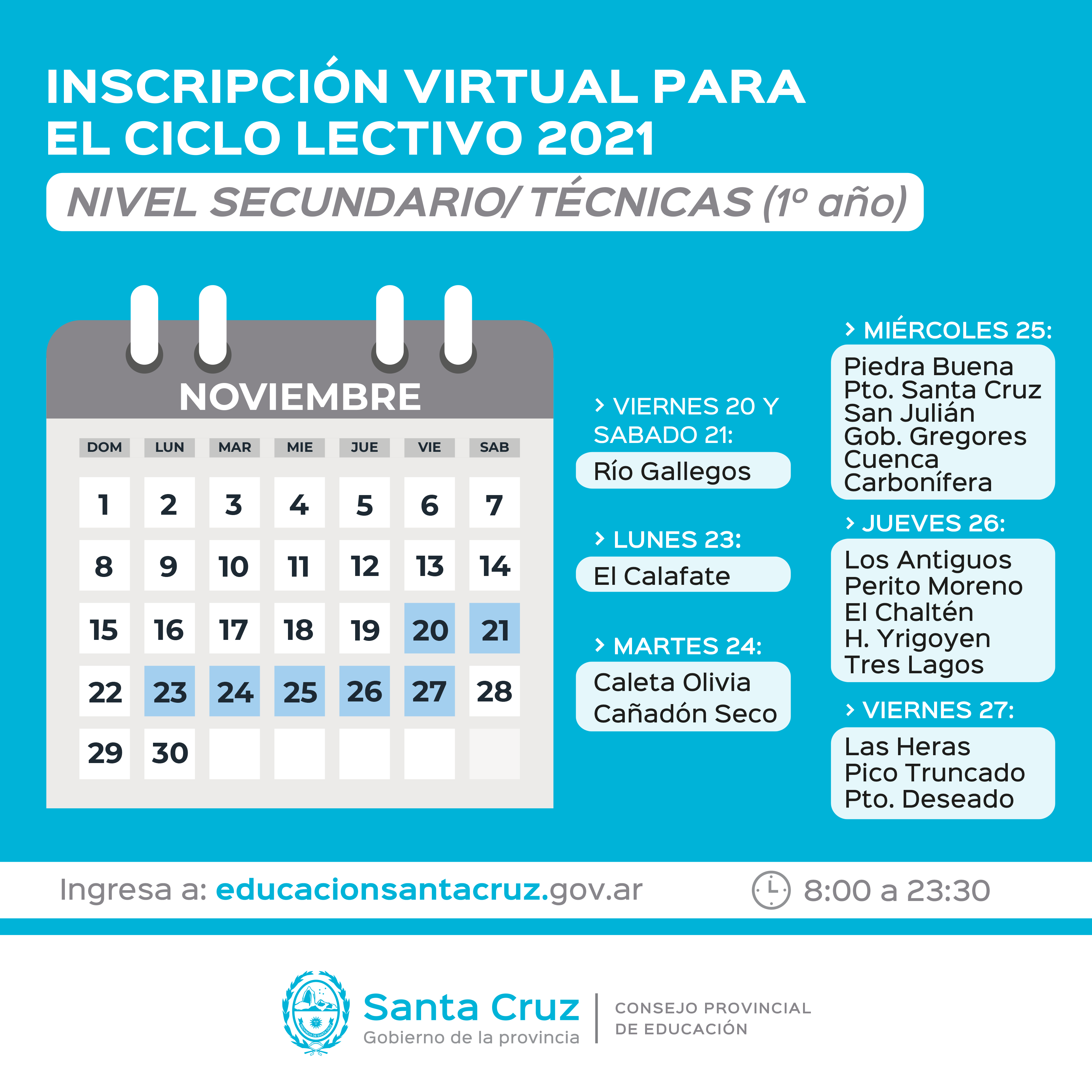 Respecto al trámite de inscripción, los padres o tutores podrán efectuar el mismo, según el cronograma de fechas por localidad, en el horario de 8:00 a 23:30, ingresando a la página http: //educacionsantacruz.gov.ar/. Una vez en la misma se encontrarán con el banner. Al clickear alguna de las opciones serán inmediatamente direccionados a un formulario que deberán completar con la información requerida.