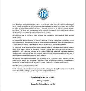 «Este 12 de Junio nos concentraremos a las 14 Hs en Kirchner y San Martin de nuestra ciudad capital con la urgente necesidad de hacerle llegar nuestro pedido de rechazo a la Ley Bases, que significa un grave retroceso para nuestros derechos y nuestras condiciones de vida, en materia laboral,
