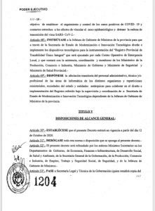 Artículo 48º.- INSTRÚYASE a la Jefatura de Gabinete de Ministros de la provincia para que a través de la Secretaría de Estado de Modernización e Innovación Tecnológica diseñe e implemente los dispositivos tecnológicos para la instrumentación del “Registro Provincial de Trazabilidad Único Integral” que será ejecutado por cada Centro Operativo de Emergencia Local, y que contará con la asistencia, coordinación y monitoreo de los Ministerios de la Producción, Comercio e Industria, Ministerio de Gobierno y Ministerio de Seguridad y Ministerio de Salud Provincial.-