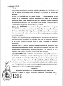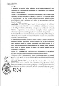 EN el artículo 35 se instruye a “las Municipalidades de Rio Gallegos, El Calafate y Caleta Olivia a intensificar el control y cumplimiento estricto de los protocolos de funcionamiento de las actividades y servicios esenciales y/o autorizadas, aplicando de corresponder las sanciones conminatorias (multas, clausuras, inhabilitaciones, etc.) que resulten pertinentes en el marco de su competencia, sin perjuicio de dar intervención a la autoridad judicial en los términos de los artículos 205 y 239 y cctes del Código Penal de la Nación.