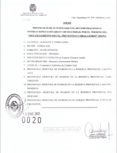 El Consejo Agrario Provincial, en conjunto con el Ministerio de la Producción, Comercio e Industria y la Secretaría de Estado de Turismo, informa que el Ministerio de Salud y Ambiente, mediante resolución 0020 del 12 de enero de 2021, aprobó los protocolos de apertura de ingreso a las reservas provinciales y el parque provincial cueva de las manos.