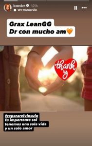 En una historia de Instagram, la cantante publicó una foto de dos manos formando un corazón y escribió: «Grax LeanGG. Con mucho amor. Repara el vínculo. Es importante sol, tenemos una sola vida y un solo amor».