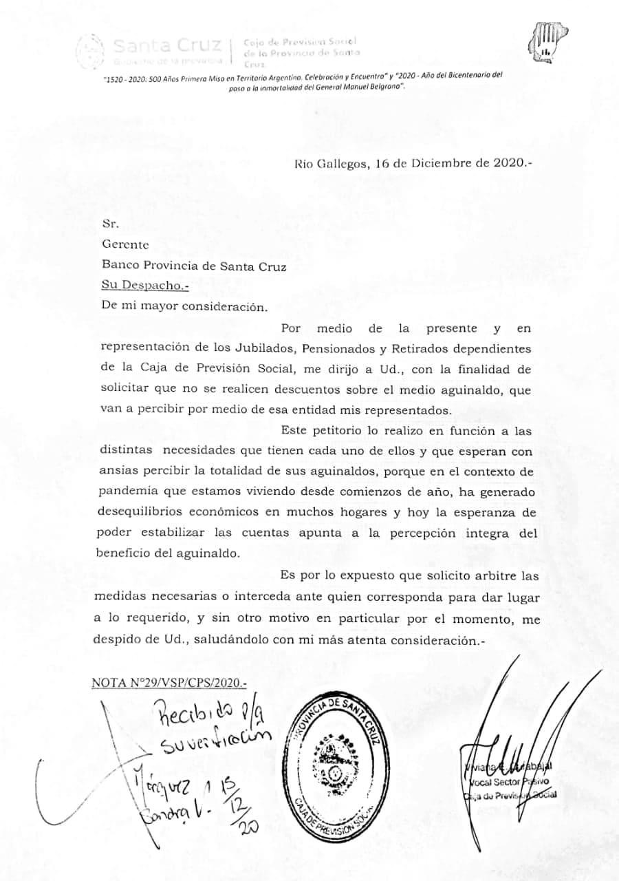 La vocal por los jubilados, pensionados y retirados de la provincia Viviana Carabajal solicitó por nota al Gerente del Banco Santa Cruz que no se realicen descuentos sobre el sueldo anual complementario (SAC).