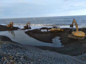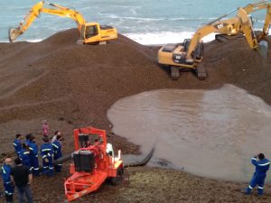 Desde el horario referido, se abocaron en el lugar trabajadores de la planta, asistidos por operadores y maquinistas que tuvieron la difícil tarea de remover entre 12 y 14 metros de profundidad del material expuesto en playa.